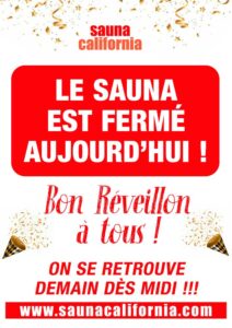 Le sauna est fermé aujourd'hui. On se retrouve demain dès midi ! BON RÉVEILLON !!