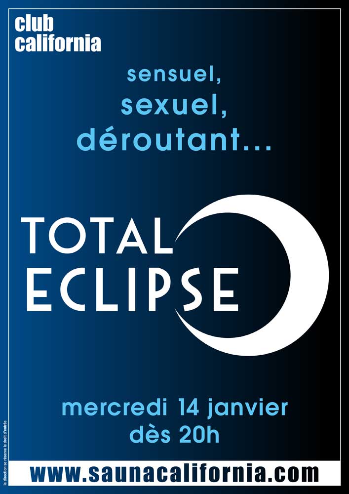 « Tous les Évènements Total Eclipse 14 janvier : 20 h 00 - 0 h 00 « TTC (toutes tendances confondues) TTC (toutes tendances confondues) » Sauna (serviette) jusqu’à 20h. Puis passage en Total Eclipse… Sensuel, sexuel, déroutant… + Google Agenda+ Ajouter à iCalendar Détails Date : 14 janvier Heure : 20 h 00 - 0 h 00 Catégorie d’évènement: Gay